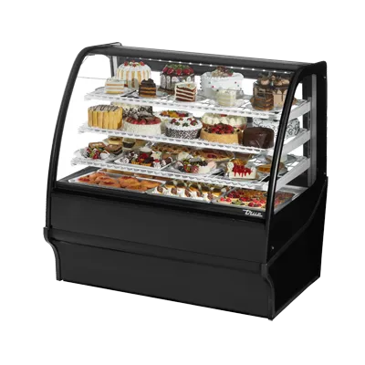 Transform your food service with the True Manufacturing TDM-R-48-GE/GE-S-S Display Case. This refrigerated bakery display merchandiser is designed to enhance the presentation and preservation of your baked goods. With its curved glass front and glass sides, it provides a clear view of your delectable treats from all angles. The two rear sliding glass doors make it easy to access and restock your products. The three tiered levels of adjustable chrome plated wire shelves allow for flexible display options. The LED interior lighting illuminates your baked goods, making them even more enticing to customers. Made in the USA with a stainless steel exterior and interior, this display case is not only durable but also easy to clean. It uses R290 Hydrocarbon refrigerant, which is environmentally friendly. With a 1/2 HP compressor and 115v/60/1-ph power supply, this display case is powerful and efficient. Upgrade your bakery or restaurant with the True Manufacturing TDM-R-48-GE/GE-S-S Display Case.