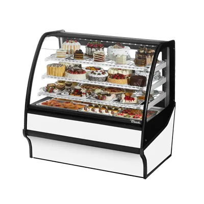 Fuel your restaurant's success with the True Manufacturing TDM-R-48-GE/GE-S-W Display Case. Designed specifically for commercial restaurant use, this refrigerated bakery display merchandiser is a must-have for showcasing your delectable baked goods. The curved glass front and glass sides provide an enticing view of your treats, while the two rear sliding glass doors allow for easy access and restocking. With three tiered levels of adjustable white PVC coated wire shelves, you can arrange your products in an organized and visually appealing manner. The LED interior lighting illuminates your baked goods, making them even more irresistible to customers. Made in the USA with a stainless steel exterior and white powder coated interior, this display case is not only durable but also easy to clean. The use of R290 Hydrocarbon refrigerant ensures energy efficiency, while the 1/2 HP compressor provides reliable cooling. Trust True Manufacturing to deliver high-quality equipment that enhances your bakery's presentation and boosts sales.
