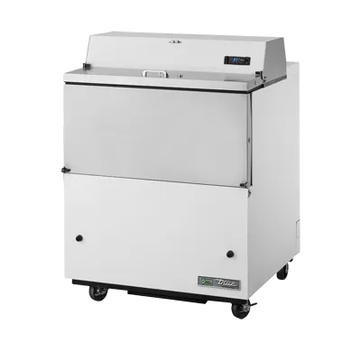 Kitchen innovation at its best, the True Manufacturing TMC-34-SS-HC Milk Cooler/Station is a must-have for any commercial restaurant. This mobile milk cooler is designed to keep your milk products fresh and easily accessible. With its forced-air cooling system, it ensures consistent temperatures between 33 - 38F, guaranteeing optimal storage conditions. The stainless steel drop front/hold-open flip-up lids provide easy access to the contents, while the lock ensures the security of your valuable inventory. The white vinyl exterior not only adds a sleek and professional look to your kitchen but also makes it easy to clean and maintain. Inside, the stainless steel interior and floor offer durability and hygiene. The two heavy-duty floor racks provide ample storage space for up to 8 crates of milk. Equipped with a digital thermometer, you can easily monitor and adjust the temperature as needed. The TMC-34-SS-HC also features 4" castors for easy mobility and a 1/5 HP compressor for efficient cooling. Made in the USA, this milk cooler is cULus and UL EPH Classified, ensuring its quality and safety. Upgrade your restaurant's milk storage with the True Manufacturing TMC-34-SS-HC Milk Cooler/Station.