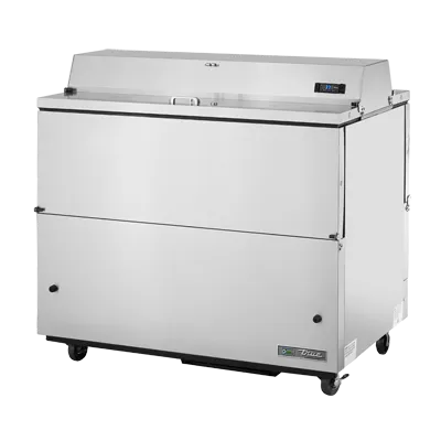 Serve with pride with the True Manufacturing, TMC-49-S-DS-SS-HC Milk Cooler / Station. This mobile milk cooler is perfect for commercial restaurant use, ensuring that your milk stays fresh and easily accessible. With its forced-air cooling system, this cooler maintains a temperature range of 33 - 38F, keeping your milk at the perfect serving temperature. The dual-sided stainless steel drop front/hold-open flip-up lids provide easy access to the 12 crates of milk that this cooler can hold. The stainless steel exterior and interior, along with the stainless steel floor, make this cooler durable and easy to clean. The three heavy-duty floor racks allow for organized storage of your milk crates. With its digital thermometer and 4" castors, this milk cooler is convenient and user-friendly. Made in the USA and certified by cULus and UL EPH Classified, you can trust the quality and reliability of True Manufacturing. Upgrade your restaurant's milk storage with the True Manufacturing, TMC-49-S-DS-SS-HC Milk Cooler / Station.
