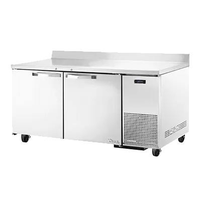 Optimize your kitchen efficiency with the True Manufacturing TWT-67-HC~SPEC3 Refrigerated Counter. This two-section work top refrigerator is a game-changer for commercial restaurants. With its SPEC Package 3, it offers a 16-gauge stainless steel top with a rear splash, ensuring durability and easy cleaning. The stainless steel front, sides, and back add a sleek and professional look to your kitchen. Inside, you'll find a spacious stainless steel interior with four shelves, providing ample storage for your ingredients. The two heavy-duty stainless steel doors come with steel handles and a door lock for added security. The electronic temperature control with a digital display allows you to easily monitor and adjust the temperature. With 5" castors and a side mount front breather, this refrigerator is easy to move and position in your kitchen. It runs on R290 Hydrocarbon refrigerant and has a 1/10 HP motor, ensuring energy efficiency. Made in the USA, this True Manufacturing Refrigerated Counter is cULus and UL EPH Classified, guaranteeing its quality and safety. Upgrade your kitchen with this reliable and efficient work top refrigerator.