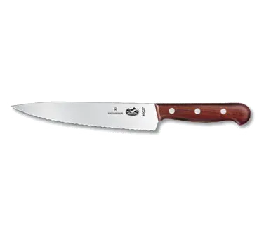 Transform Your Restaurant's Culinary Performance with the Victorinox Swiss Army, 5.2030.19, Knife, Slicer. This professional-grade chef's knife is a must-have tool for any commercial kitchen. With its 7-1/2" wavy edge blade and stiff construction, it effortlessly slices through meats, vegetables, and fruits, ensuring precise and consistent cuts every time. The 1-1/2" width at the handle provides a comfortable grip, allowing for extended use without fatigue. The rosewood handle adds a touch of elegance and durability to the knife, making it a stylish addition to any kitchen. Designed by Victorinox Swiss Army, a trusted name in cutlery, this knife is built to withstand the demands of a busy restaurant environment. Whether you're slicing roast beef for sandwiches or creating beautiful garnishes for your dishes, this Victorinox Swiss Army knife will elevate your culinary creations to new heights.