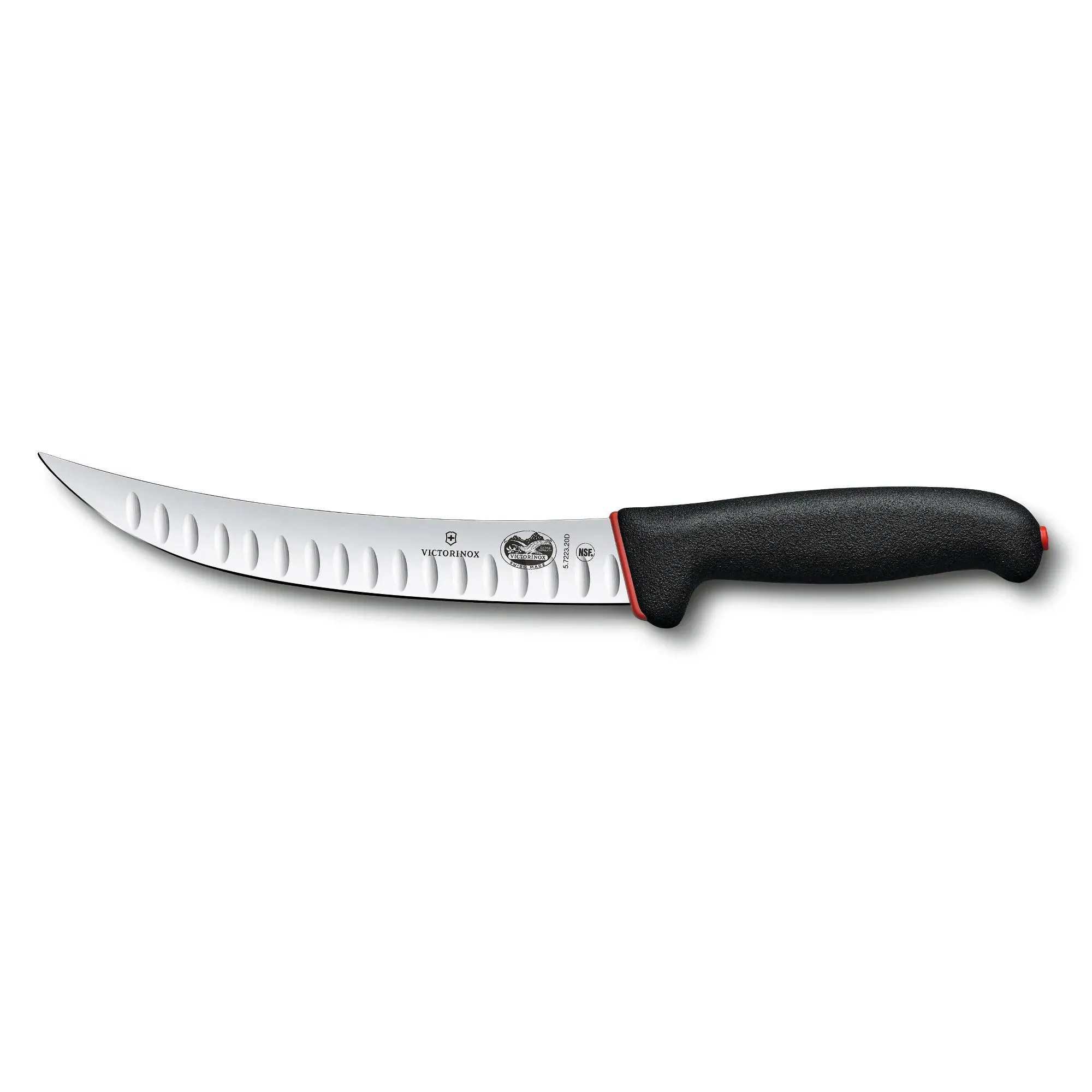 Where Innovation Meets Flavor with the Victorinox Swiss Army, 5.7223.20D Breaking Knife. This professional-grade knife is a must-have for any commercial restaurant. With its 8" granton blade made of high-quality stainless steel, it effortlessly slices through meat, making it perfect for breaking down large cuts. The black Fibrox Pro dual-grip non-slip handle ensures a secure and comfortable grip, even in busy kitchen environments. Designed by Victorinox Swiss Army, a trusted name in cutlery, this knife is built to withstand the demands of a commercial kitchen. It is NSF certified, guaranteeing its safety and hygiene standards. Whether you're a chef or a butcher, this breaking knife will enhance your efficiency and precision, allowing you to deliver exceptional dishes to your customers. Upgrade your restaurant's cutting tools with the Victorinox Swiss Army Breaking Knife.