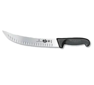 Elevate Your Restaurant's Efficiency with the Victorinox Swiss Army, 5.7323.25, Knife, Cimeter. This professional-grade knife is designed to enhance your restaurant's performance and deliver exceptional results. With its 10" curved blade and granton edge, it effortlessly slices through large cuts of meat, making it perfect for butchers and chefs alike. The black Fibrox Pro handle ensures a secure grip, even when wet, while the slip-resistant design guarantees safety in a fast-paced kitchen environment. Dishwasher safe and NSF certified, this knife is easy to clean and meets the highest standards of hygiene. Whether you're preparing succulent steaks or carving roasts, this Victorinox Swiss Army knife is a must-have tool for any commercial restaurant. Trust in its durability, precision, and versatility to streamline your kitchen operations and deliver outstanding culinary creations.